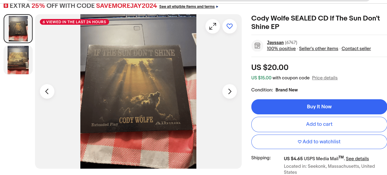 Hey All, check this out! I was going through Ebay today and I saw someone flipping one of my CD's! As you can imagine I thought this was hilarious but badass at the same time, now I won't make any money from this but I fully support it, so I thought I might send out an email blast to see if any of you were interested in buying it. Help the dude out a bit, this is the first album I ever recorded so they are somewhat rare and we didn't sell many of them compared to my recent releases. Hope you are all doing well. -Cody